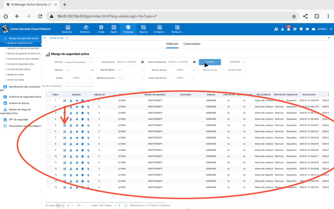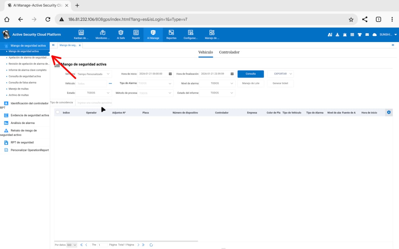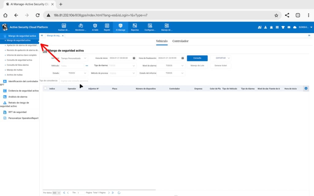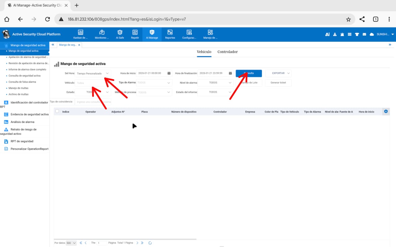 Selección de fecha, hora y vehículo. Si se requiere discriminar la información, se ajustan los filtros y se da clic en Consultar.